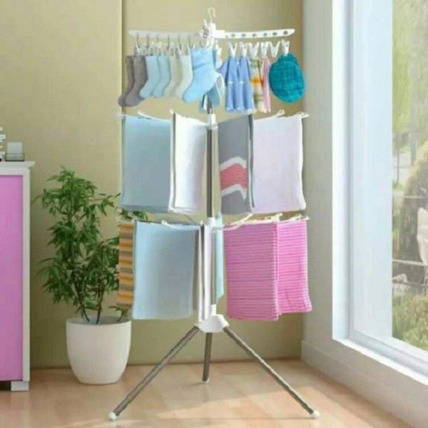 Kesulitan dalam mengeringkan pakaian anda karena keterbatasan tempaat? Foldable Clothes Drying Airer hadir dalam membantu anda mengeringkan pakaian anda. Dapat menggantung hingga 24 pakaian kecilo pada bagian atas, sedangkan layer kedua berfungsi untuk menggantung baju atau pakaian lai yang berukurang lebih besar.
